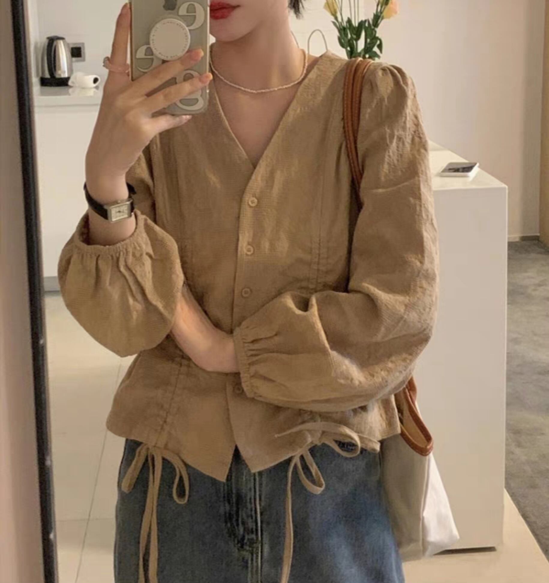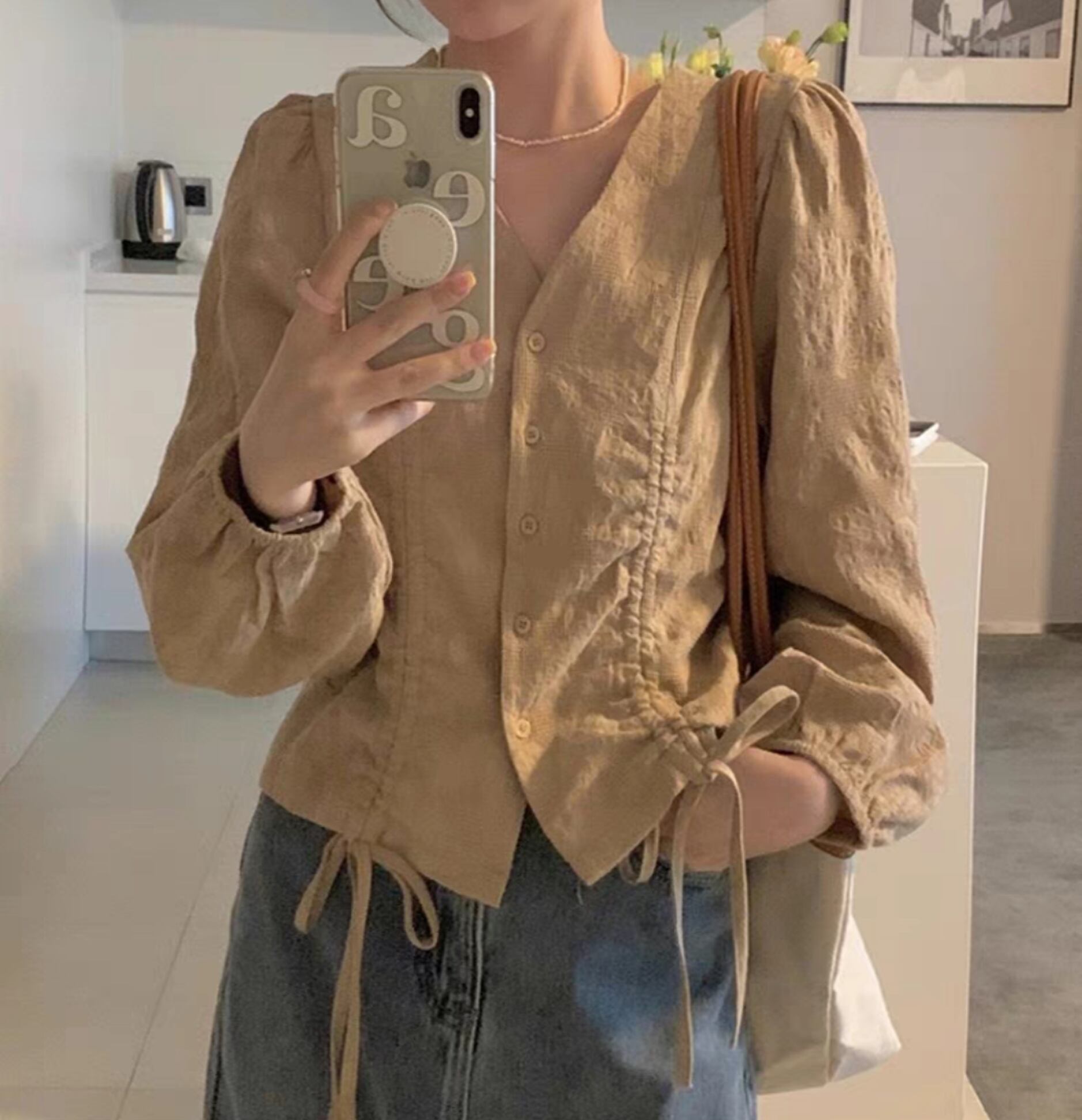 縦にシャーリングをつけたニュアンスのあるシフォンブラウスです☆Vネックで甘くなりすぎず大人っぽさもプラス♪小柄さんのために着丈を通常サイズより2㎝ほど短く作ってあります。