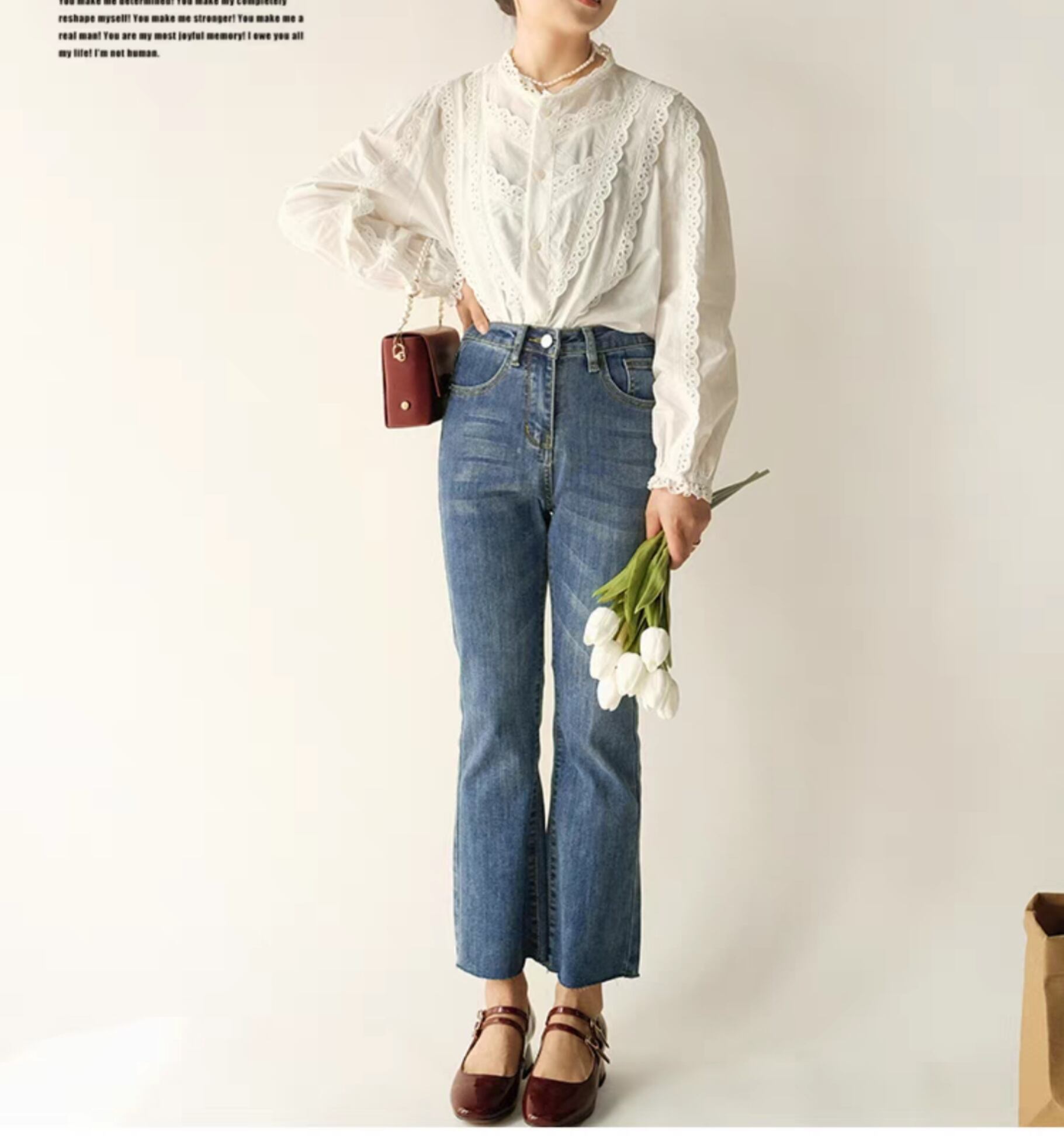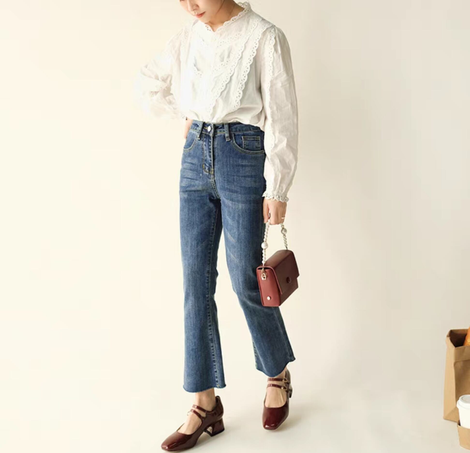 カットオフと膝から下にかけて少し広がりのあるデザインがオシャレ度UPのデニムです☆合わせやすいカラーでブラウスやTシャツ、ニットなどいろいろなコーデを楽しめます♪