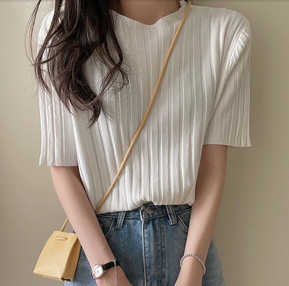 長め袖丈の落ち着いたデザインと豊富なカラーのニットTシャツです♪薄め生地で夏にぴったりです☆